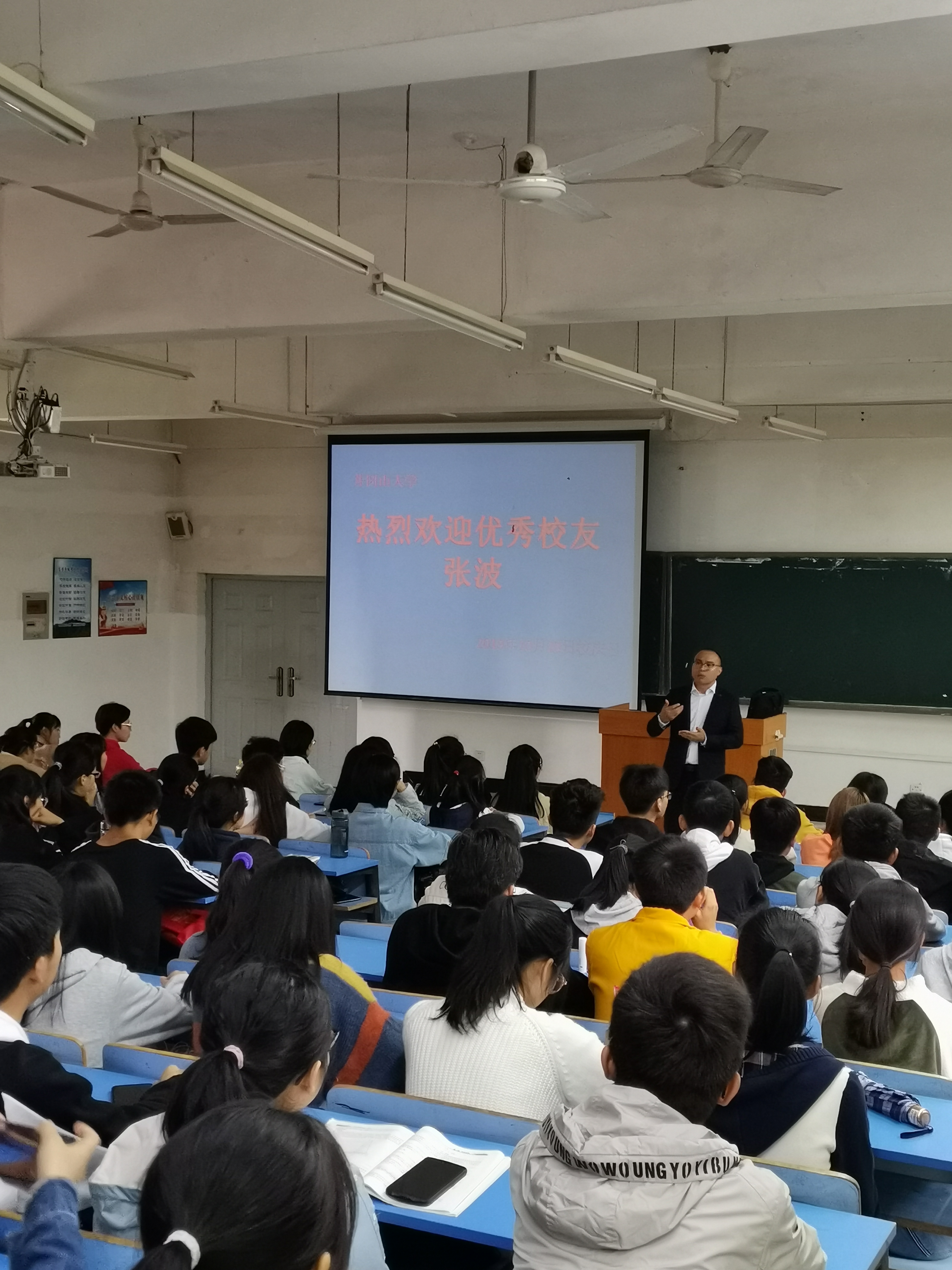 10月28日是我校校庆日,为分享创业成功校友的人生经历、生活感悟、创业历程、成功事迹等,激励在校大学生成长成才,有效促进在校大学生创新创业能力实践提升,下午我院邀请到吉安鸿基房产创始人、执行董事张波校友为在校学生作了题为《让青春更灿烂》的创业报告,130名学生到场聆听。